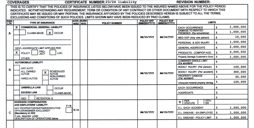 *Note: Gortin Group, LLC must be the Certificate Holder. The certificate must meet minimum limits (please see sample).